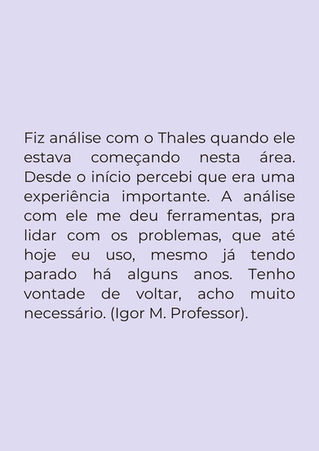 Há cinco anos, atuo como terapeuta, utilizando os dispositivos clínicos da Psicanálise, em composição com a Filosofia da Diferença. Minha trajetória se construiu sobre uma base de estudos que entrelaçam filosofia, arte, literatura e política, áreas que considero essenciais para a compreensão das relações entre o ser humano e o mundo.